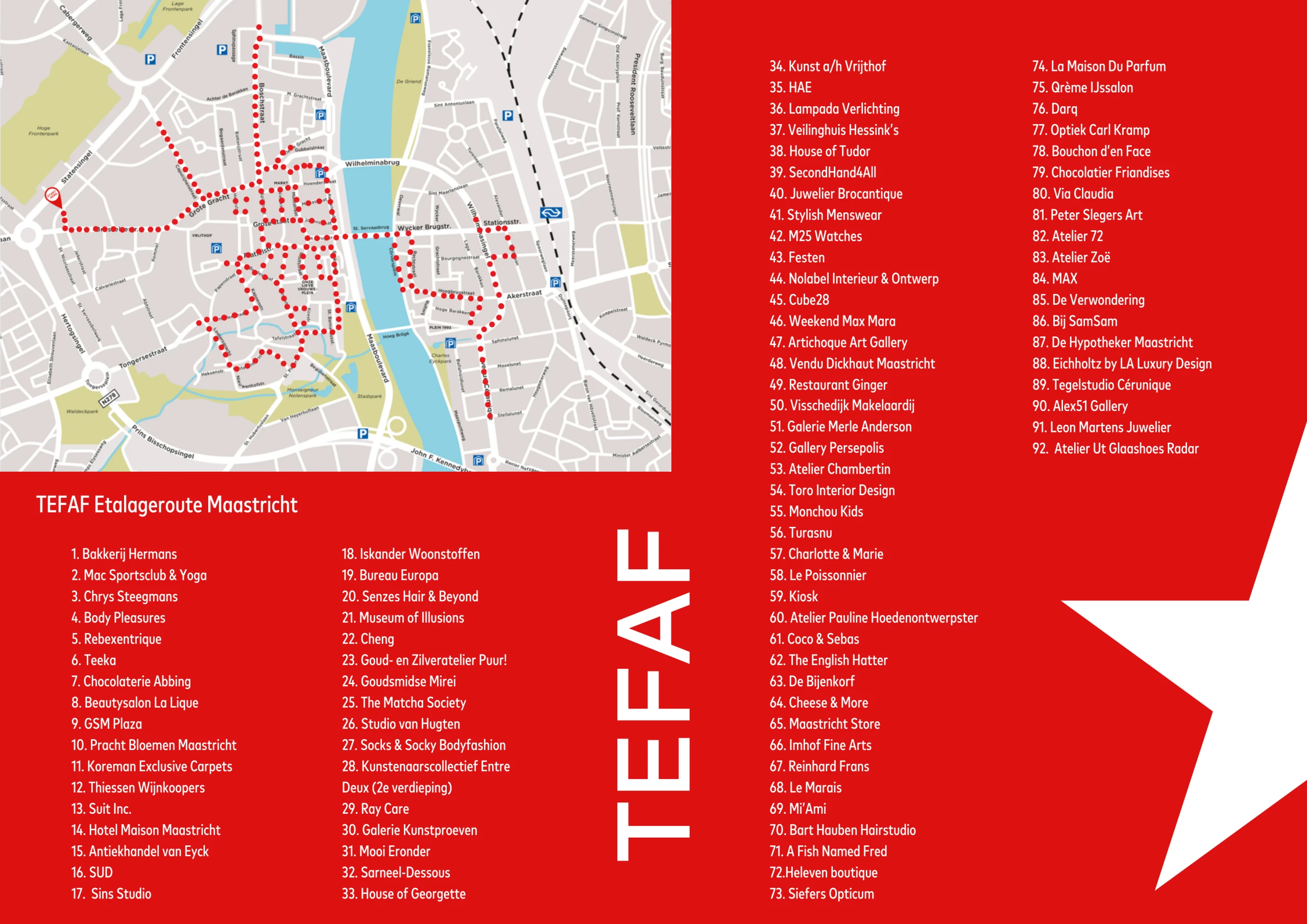 Na het succes van vorig jaar omarmen ondernemers in het centrum van Maastricht dit jaar opnieuw TEFAF. 92 Etalages in de binnenstad worden in samenwerking met lokale kunstenaars omgetoverd tot kunstwerken en brengen zo de grootste kunstbeurs ter wereld naar de straat. Wandel door de stad, laat je verrassen door de creatieve uitingen en ontdek kunst op de meest onverwachte plekken. De TEFAF-etalageroute biedt een speelse en inspirerende ervaring, waarin de kunst van verwondering centraal staat. Een geweldige manier om de stad te ontdekken en kunst vanuit een nieuwe hoek te beleven!